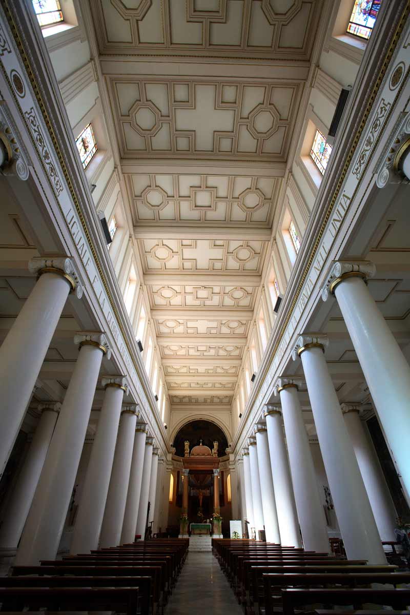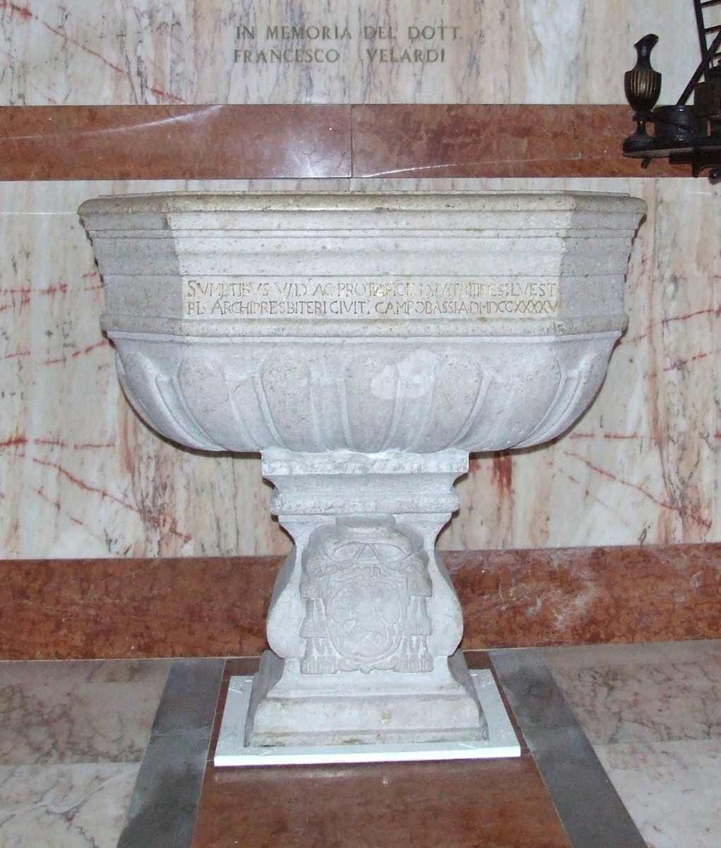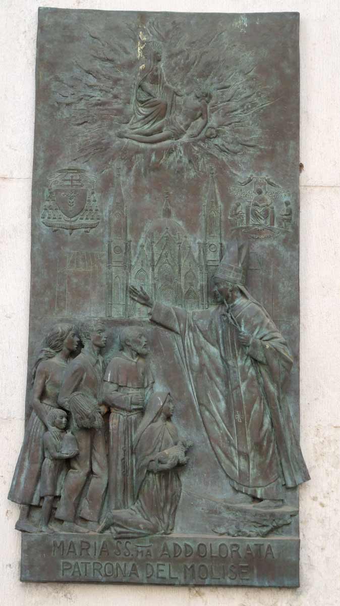 in stile neoclassico (1815 - 1829). Successivamente (1855 - 1859) fu realizzato il prònao esastilo con colonne di ordine ionico. L’interno, a tre navate senza transetto, presenta affreschi del pittore campobassano Amedeo Trivisonno (1904 - 1995) al di sopra del portone d’ingresso (“La moltiplicazione dei pani e dei pesci”, “La consegna delle Chiavi a Pietro”) e nelle cappelle del SS.Sacramento (“L’Ultima Cena”) e della Madonna del Rosario (“La battaglia di Lepanto”, “Predicazione di S. Domenico”). Nella volta dell’abside l’artista romagnolo Romeo Musa (1882 - 1960) ha affrescato “La Pentecoste”. Sede della Confraternita dei Trinitari, fu dichiarata Cattedrale nel 1927. |